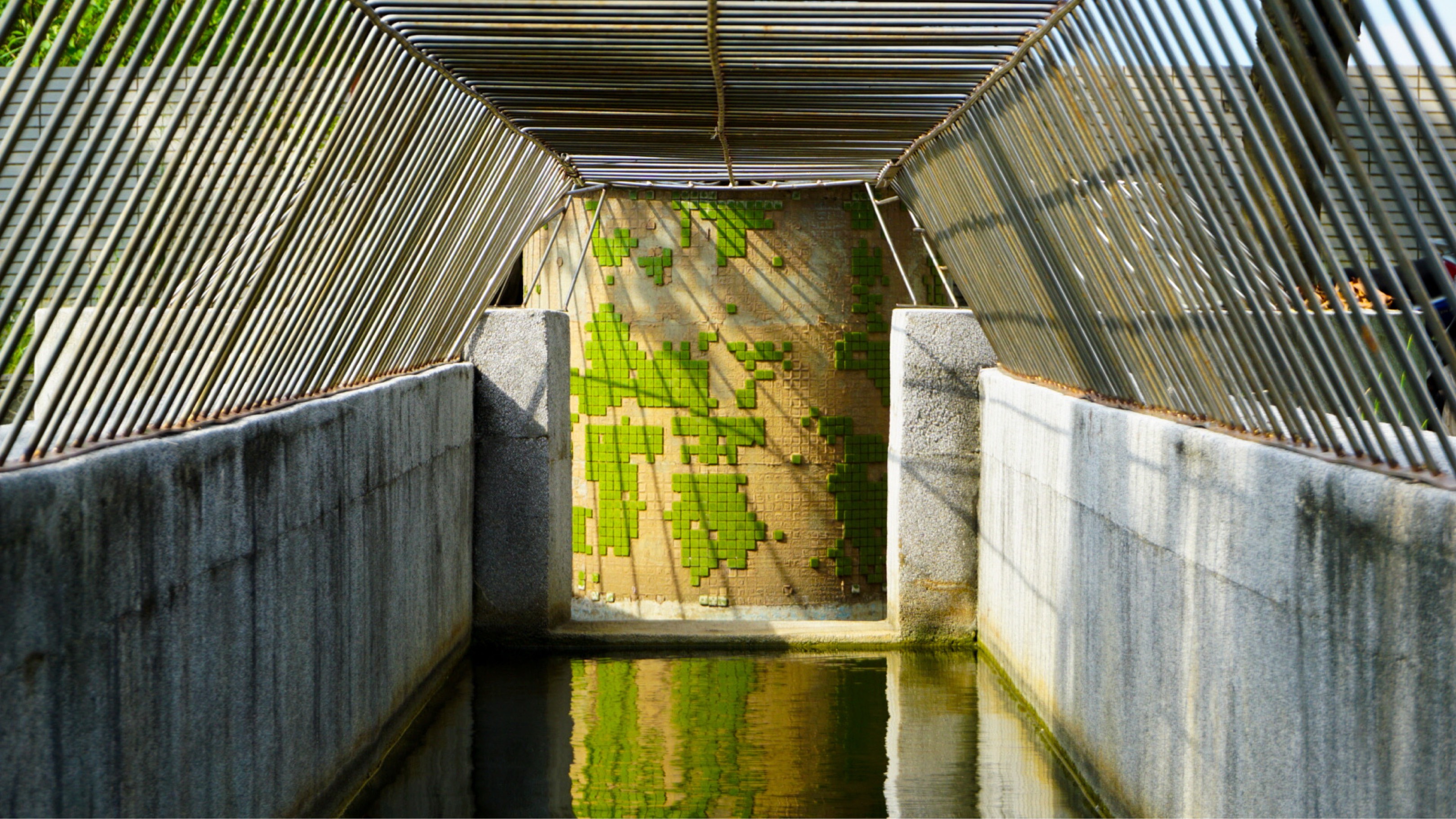 午後陽光照射在烏龜池裡磁磚剝落的牆面